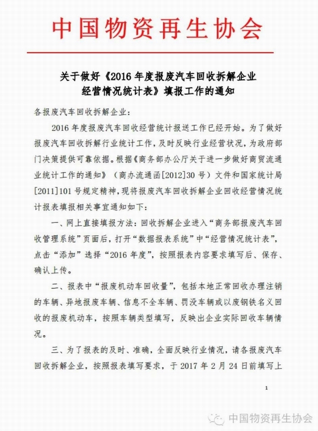 關(guān)于做好《2016年度報廢汽車回收拆解企業(yè) 經(jīng)營情況統(tǒng)計表》填報工作的通知